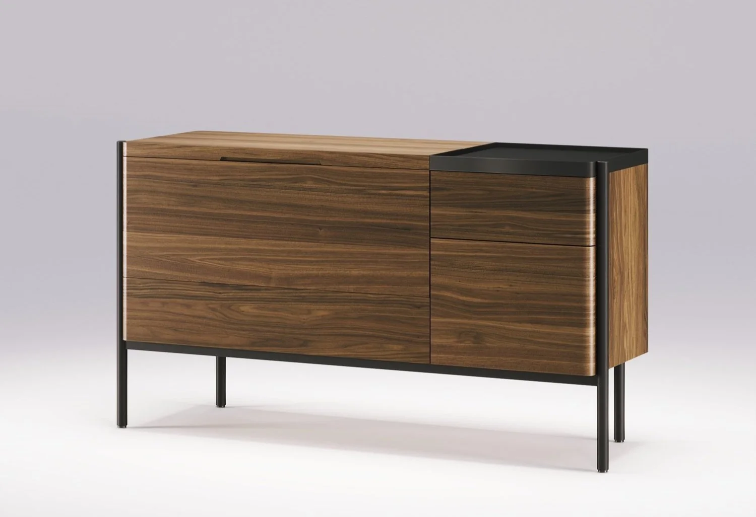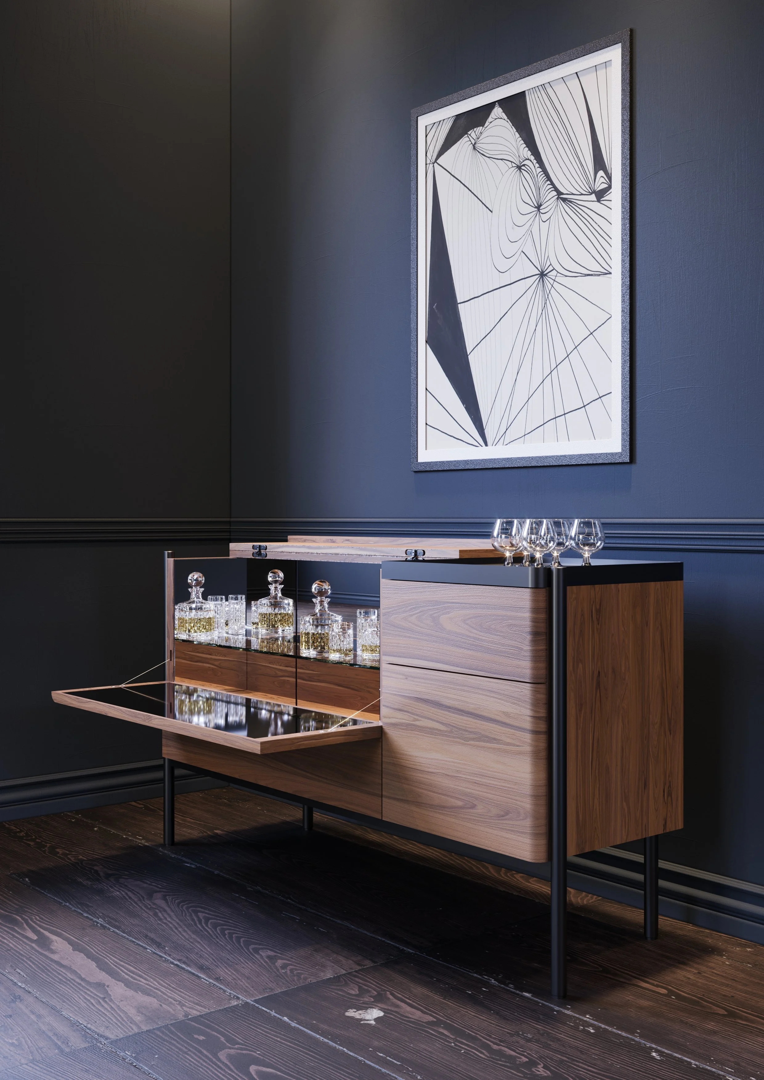 Mey is the combination of a traditional sideboard with a sophisticated drinks cabinet. The design was inspired by ancient jewelry boxes: simple, neat containers of precious and shiny objects. It hides a reflective surface where you can store your best bottles and also includes an elegant black metal tray-like surface, perfect for preparing drinks and appetizers.